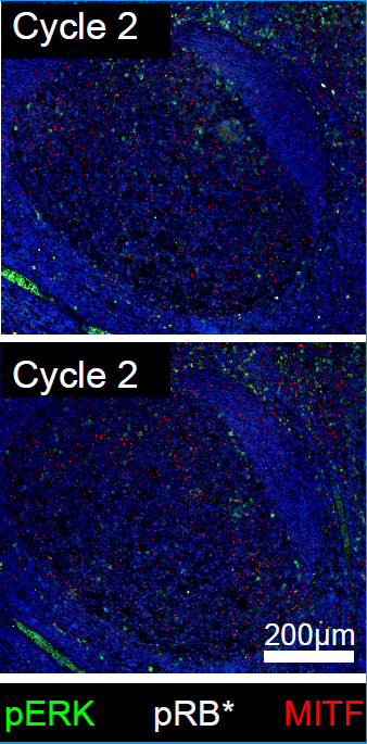 Tonsil tissue stained with pErk (green), pRb (white), and MITF (red).