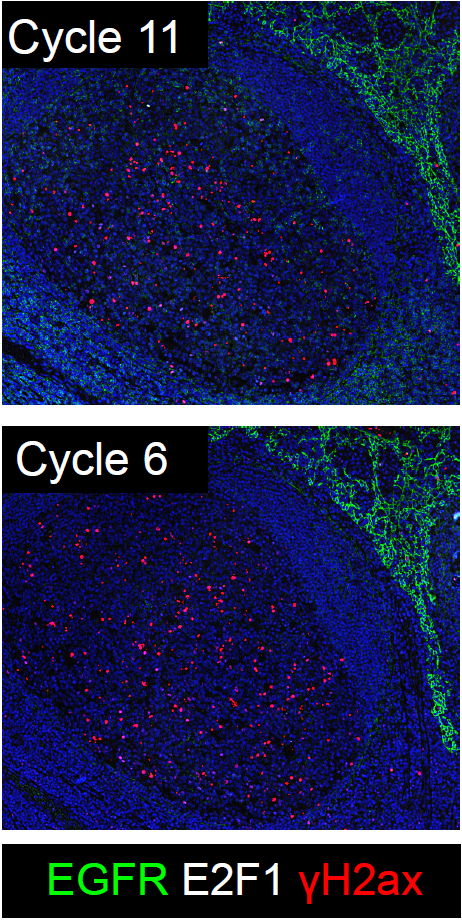 Tonsil tissue stained with EGFR (green), E2F1 (white), and γH2ax (red).