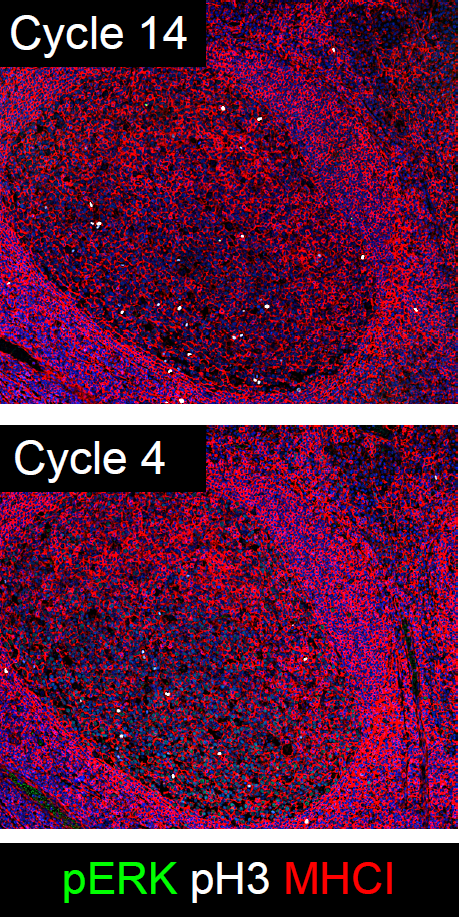 Tonsil tissue stained with pErk (green), pH3 (white), and MHCI (red).